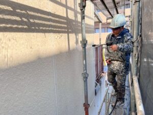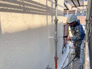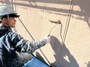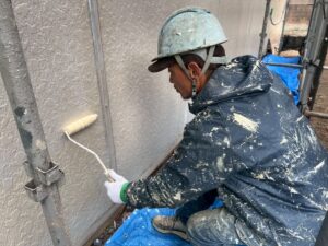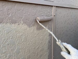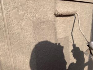 今回も塗布作業は3回に分けて行いました。初めの下塗りでは、外壁と2回目、3回目の塗料の密着性を高めるために塗布してまいります。その後2回目では、防水機能や紫外線からの保護機能がある塗料を塗布し、最後にその塗料を保護する目的で3回目を塗布いたします。
